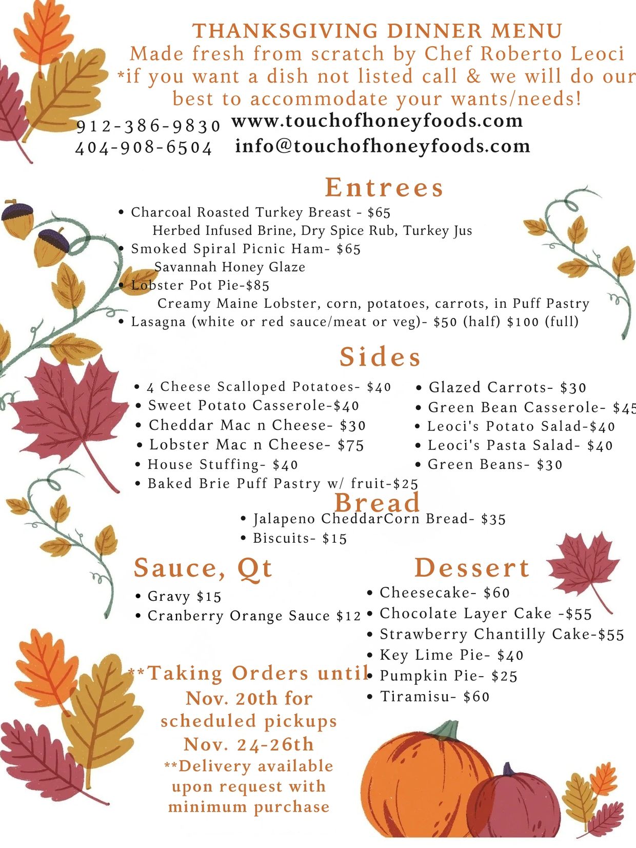 The menu above is a mix of classics and favorites with a bit of Chef Leoci's flair. If there is a dish that you want & it is not listed- reach out to discuss how we can make this an unforgettable Thanksgiving!